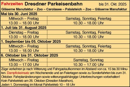 Pierwsza taka kolejka miniaturowa w Dreźnie jeździła w 1930 r., gdy odbyła się tu słynna w owych latach wystawa higieny. Powstała znów w roku 1950 jako już nieodłączny składnik parku z dużym i małym kursem. Pierwotny plan przewidział, by kolejka krążyła po parku tylko przez rok; jednak cieszyła się ona tak ogromną frekwencją, że nie przestała już kursować do dziś dnia. Kolejka startuje na Strassburger Platz blisko Szklanej Manufaktury i jeździ aż do Ogrodu Zoologicznego, do Letniego Pałacu oraz sceny plenerowej. Zapraszamy przede wszystkim Państwa dzieci na przejażdżkę podczas następnej wizyty w Dreźnie.